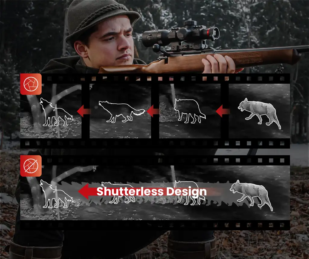 The innovative shutterless 3.0 technology eliminates the clicking sound and image freezing, ensuring uninterrupted real-time footage during actual hunts, in case any shots are lost or missed during calibration.