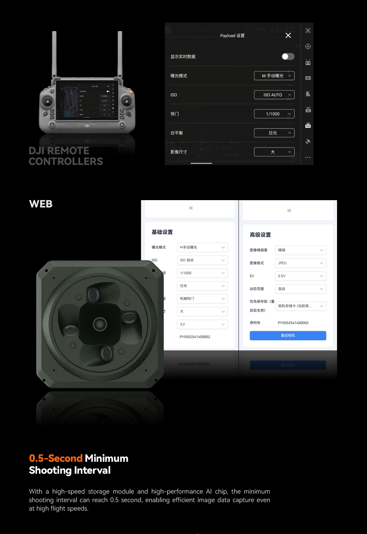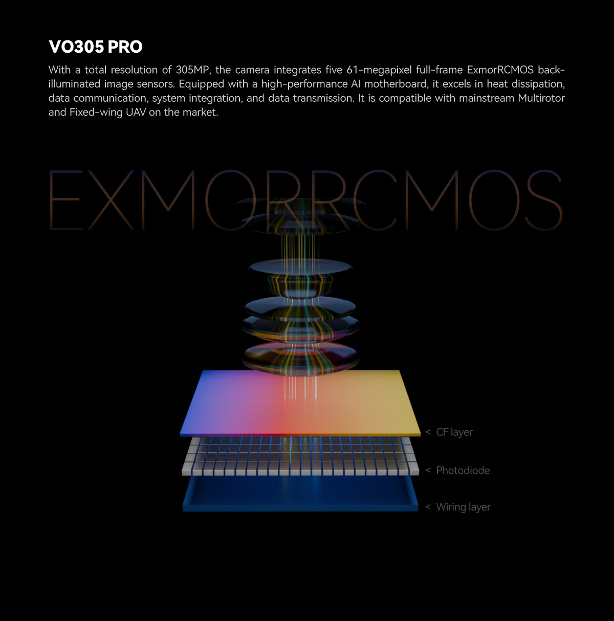 With a total resolution of 305MP, the camera integrates five 61-megapixel full-frame ExmorRCMOS back-illuminated image sensors. Equipped with a high-performance AI motherboard, it excels in heat dissipation, data communication, system integration, and data transmission. It is compatible with mainstream Multirotor and Fixed-wing UAV on the market.