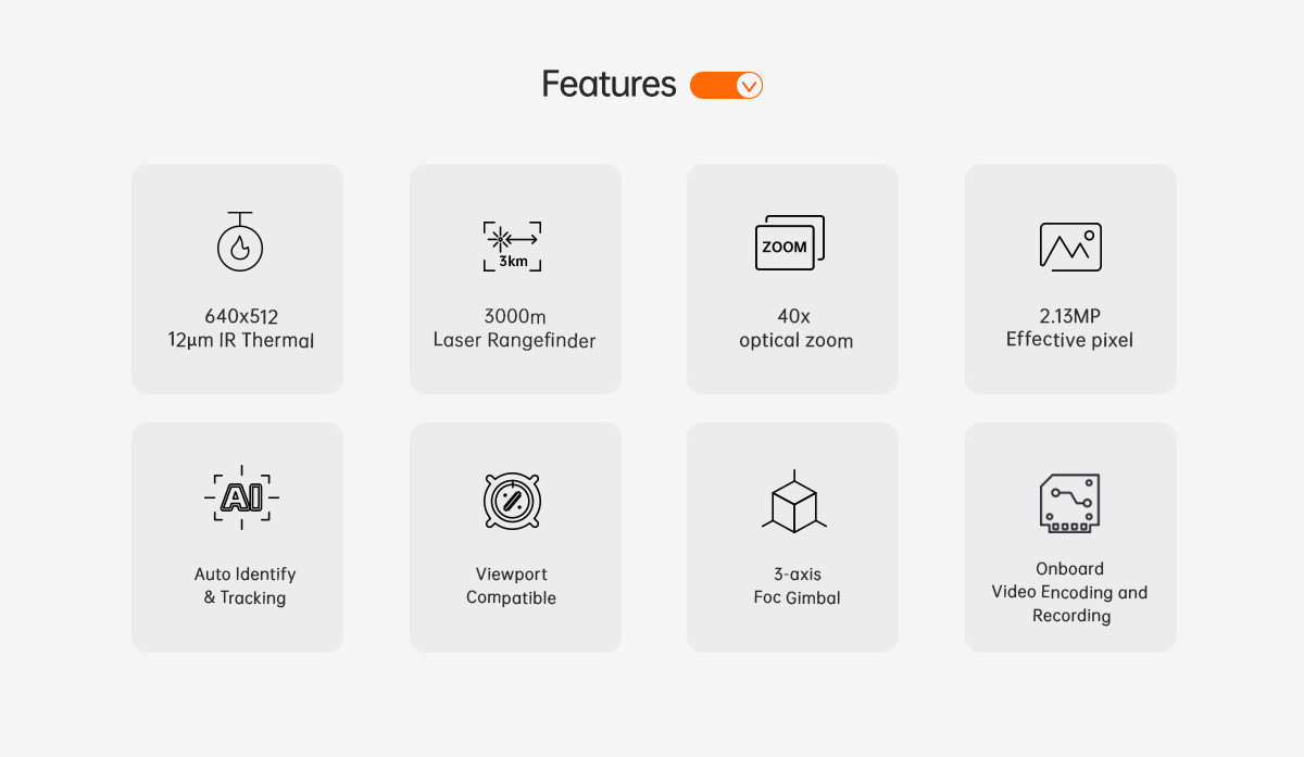 Pitch/Tilt:-60°~130°, Roll: ±40°, Yaw/Pan: ±300° / ±360°*N (IP output version) |