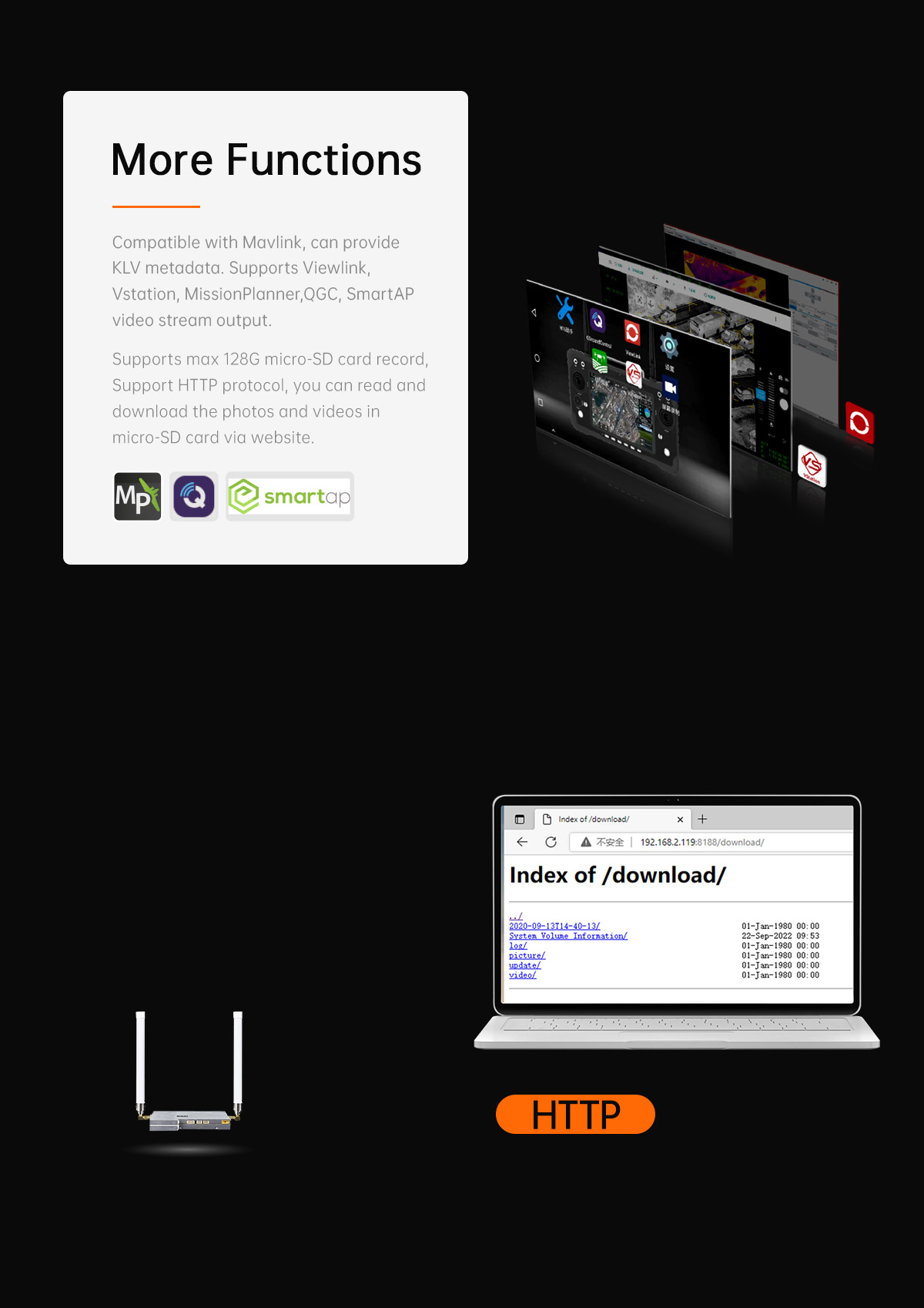 micro HDMI(1080P 30fps/60fps) / IP (RTSP/UDP 720p/1080p 30fps) |