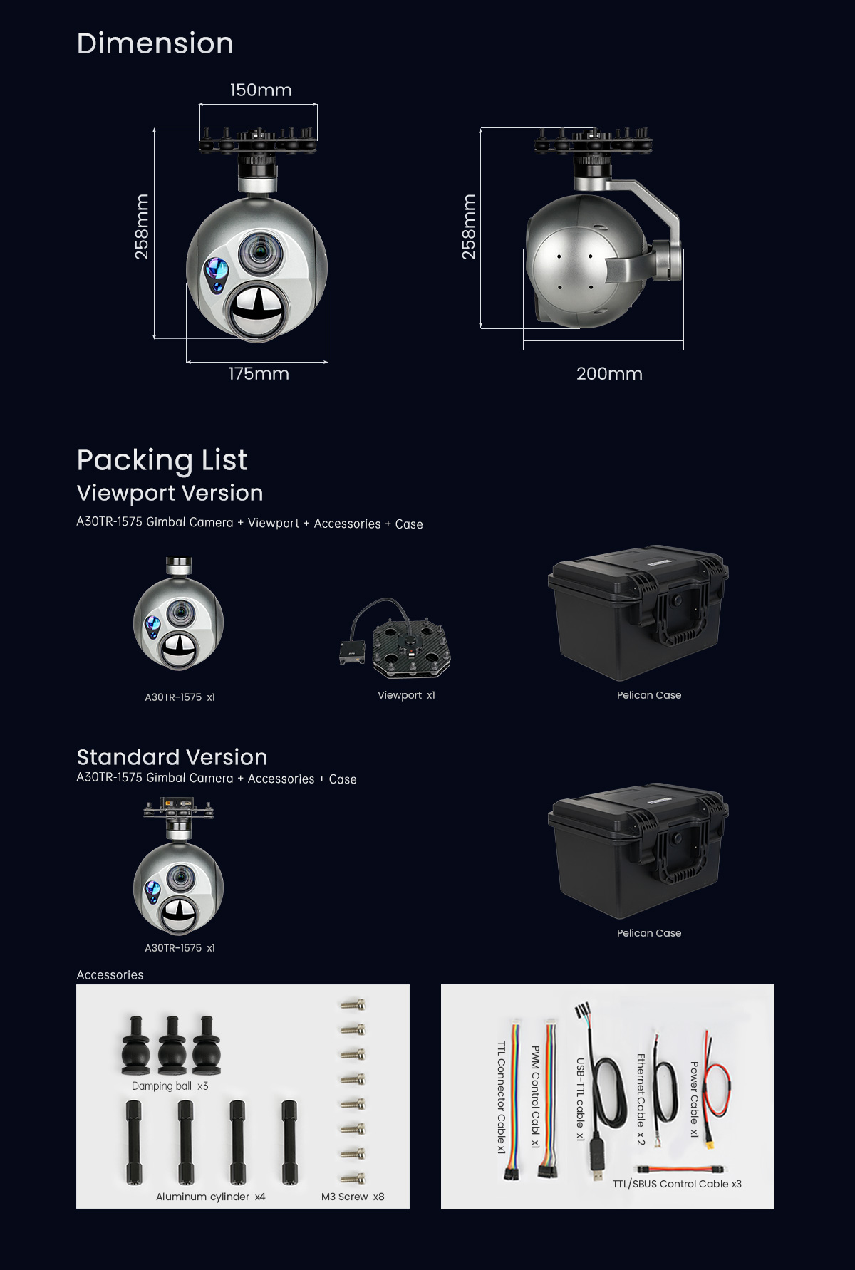 | Accessories | 1pc gimbal camera device, screws, aluminum cylinders, damping balls, damping boards, 1pc USB to TTL cable / Hight quality plastic box with foam cushion |