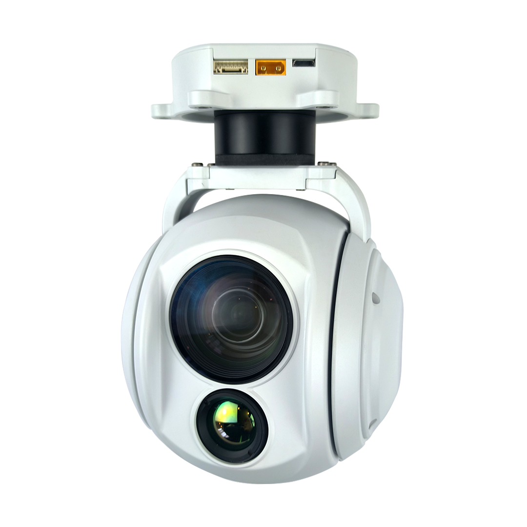 DYD30G619 is a professional two-axis stabilization gimbal camera with integrated 270x hybrid zoom daytime CMOS sensor and 19mm focal length 640×512 thermal imaging sensor, supporting Ethernet RTSP output. Its housing is full metal. The gimbal uses a high-precision encoder FOC control scheme, characterized by high stability, small size, light weight, and low power consumption. The visible light sensor employs a wide dynamic CMOS sensor with an effective pixel of 2 million, while the thermal imaging sensor uses a 640×512 resolution vanadium oxide detector with a baffle design. The camera supports RTSP streaming output, 4 Picture-in-Picture modes and 10 pseud-color modes for thermal. Both network and serial port as well as S.BUS can control the camera and gimbal, and it supports local TF card storage.