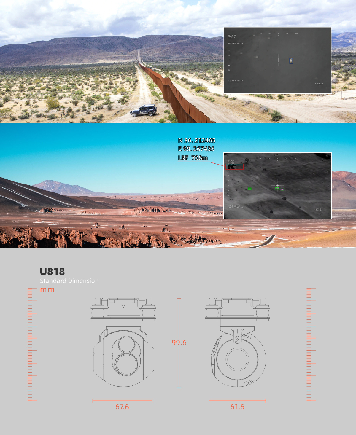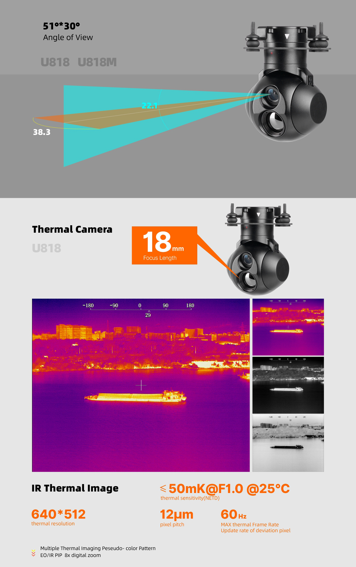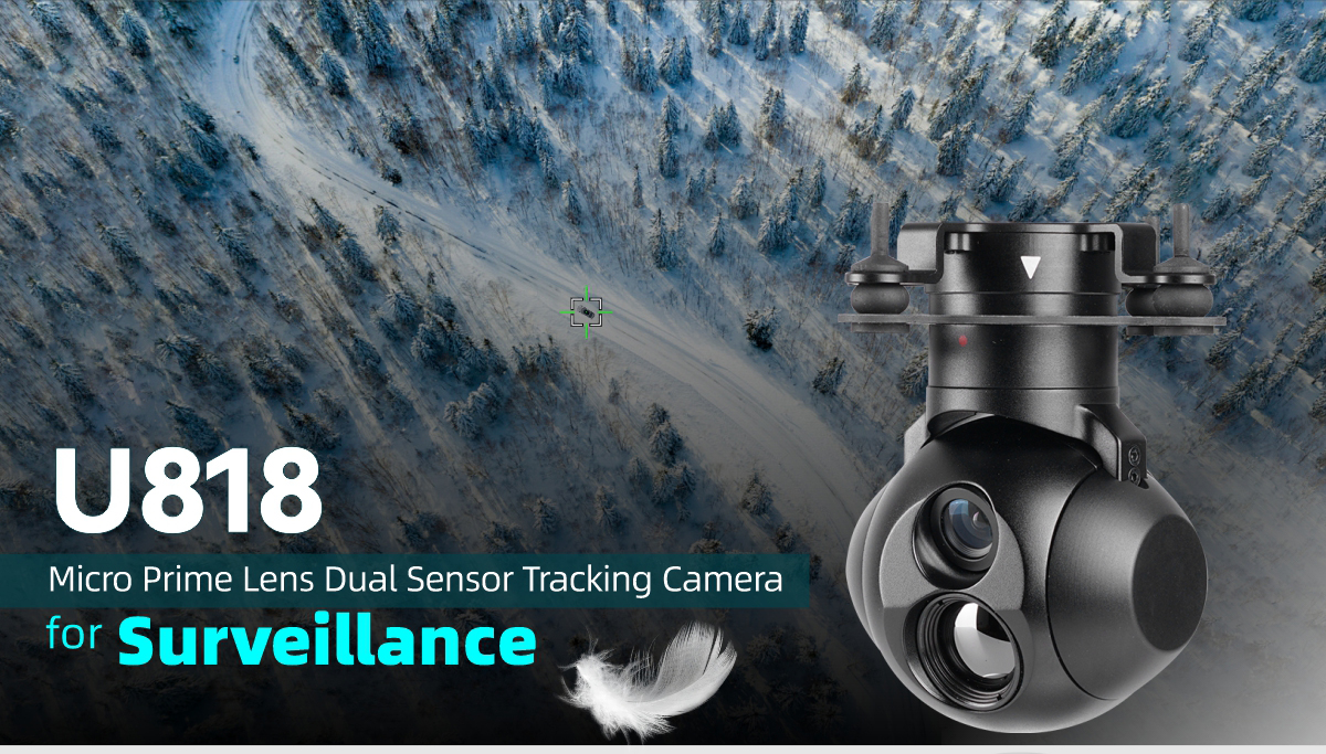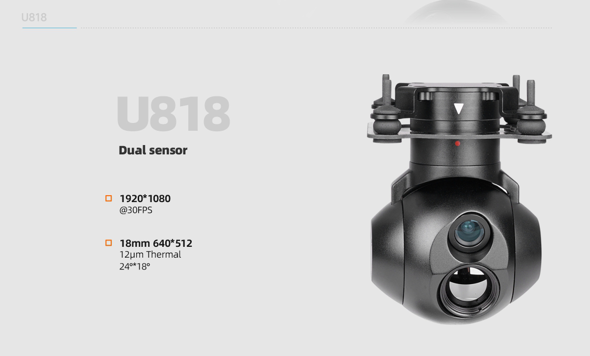 MU818is a dual-sensorgimbal camera of Viewpro micro sereis Hawkeye series, featuring 260g light net weight, small volume and compact structure, which integrates a 8mm prime lens camera and a18mm lens 640*512 thermal camera. It with 2-axis high-precision gimbal which has advantages of better metal texture, anti-interference and better heat dissipation. It widely used in surveillance, large area reconnaissance and other other UAV industrial applications.
