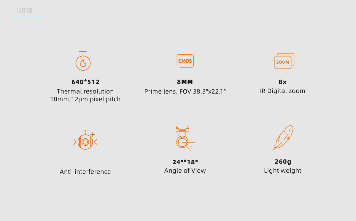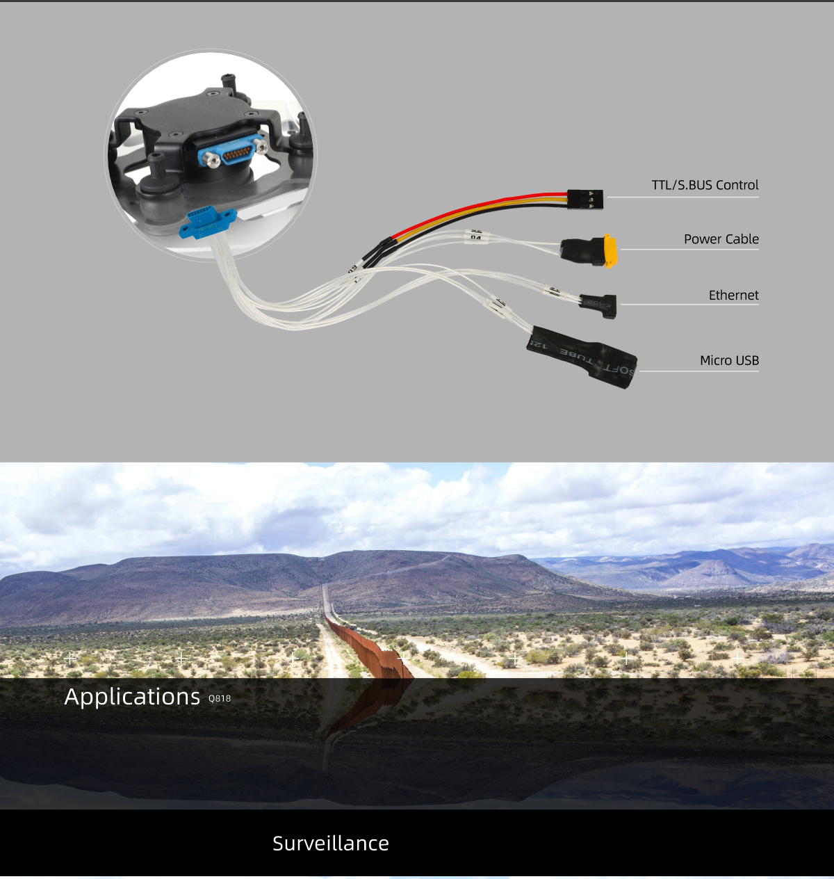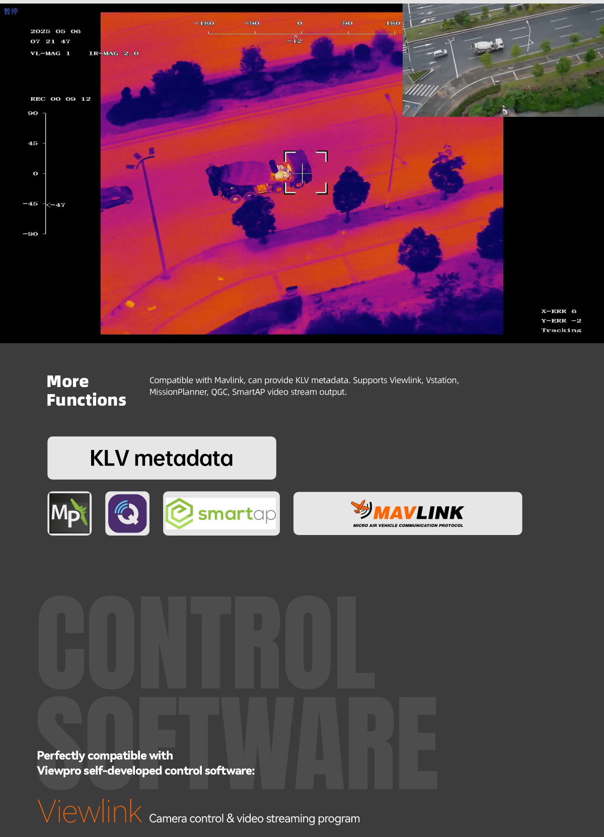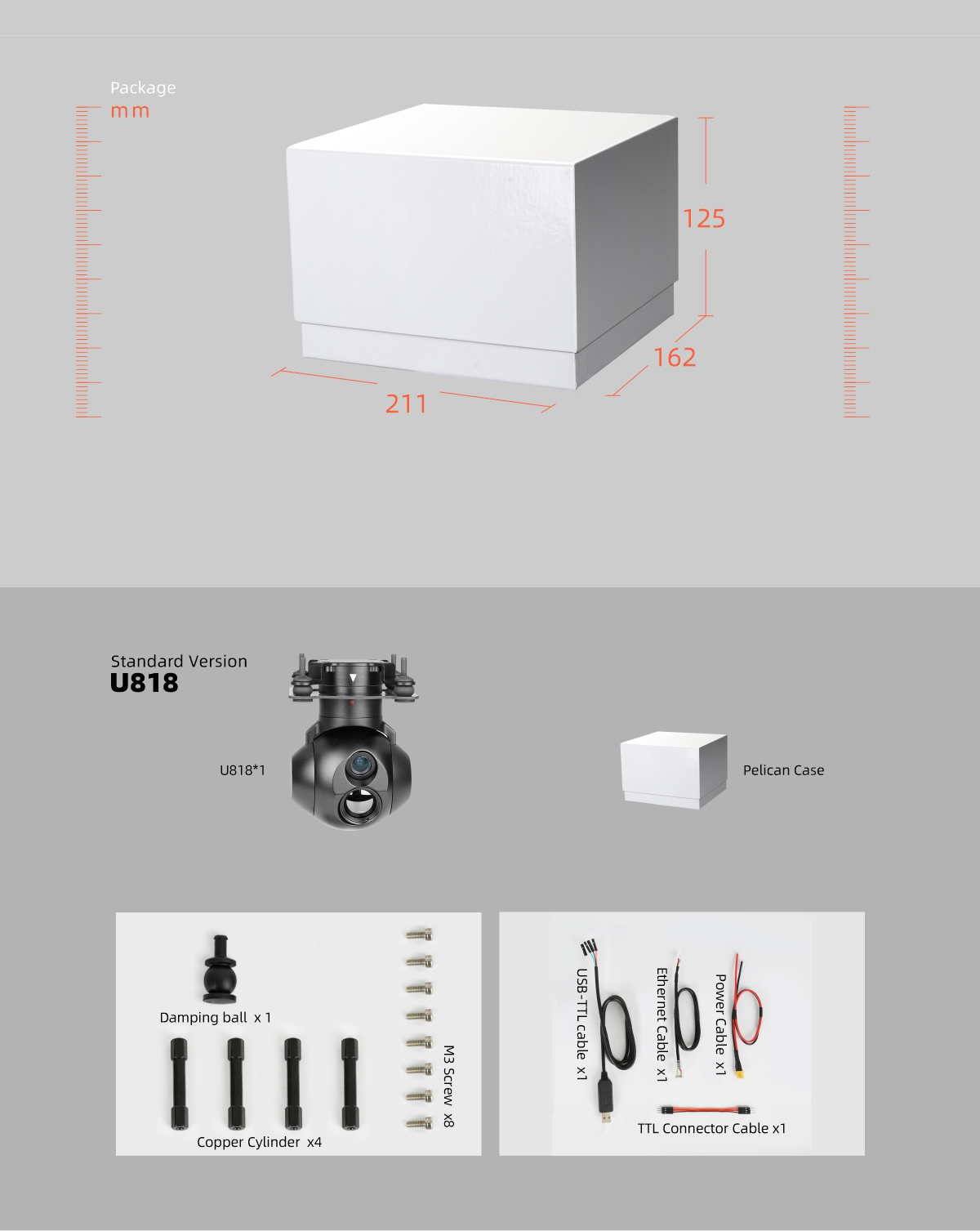 MU818is a dual-sensorgimbal camera of Viewpro micro sereis Hawkeye series, featuring 260g light net weight, small volume and compact structure, which integrates a 8mm prime lens camera and a18mm lens 640*512 thermal camera. It with 2-axis high-precision gimbal which has advantages of better metal texture, anti-interference and better heat dissipation. It widely used in surveillance, large area reconnaissance and other other UAV industrial applications.