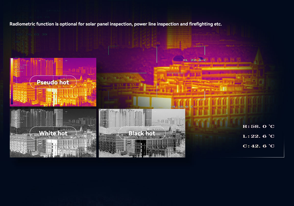 Temperature bar (psudo color display) max temp, min temp, FOV center temp (Optional) |