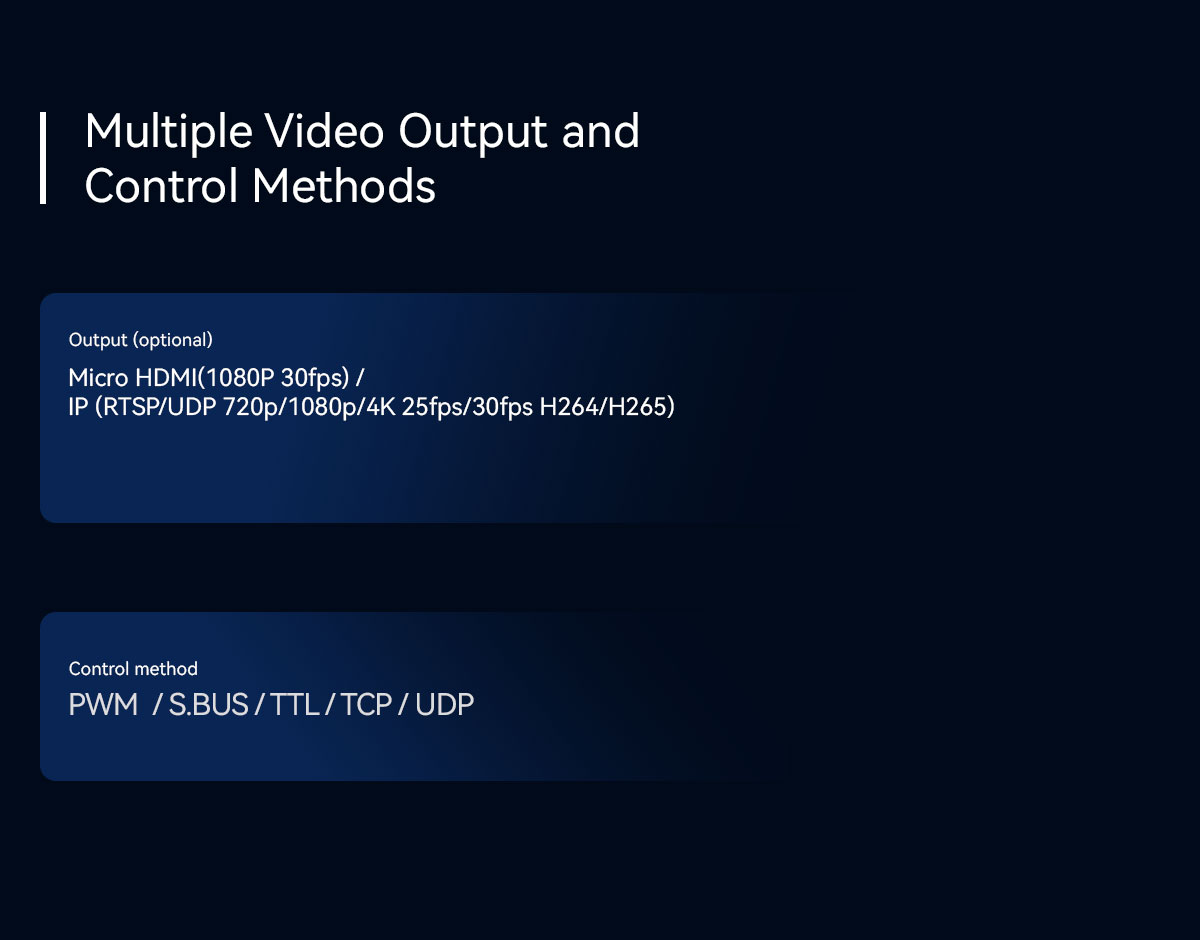 Micro HDMI(1080P 30fps) / IP (RTSP/UDP 720p/1080p/4K 25fps/30fps H264/H265) |