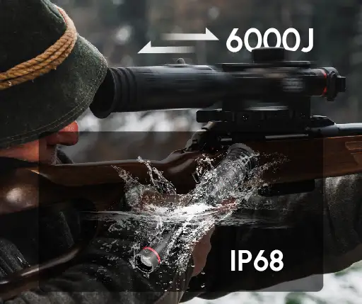Considering the harsh environment in the field, the scope must be sufficiently durable and sturdy. It features shock resistance up to 6000J to withstand recoil and an IP68 waterproof rating.