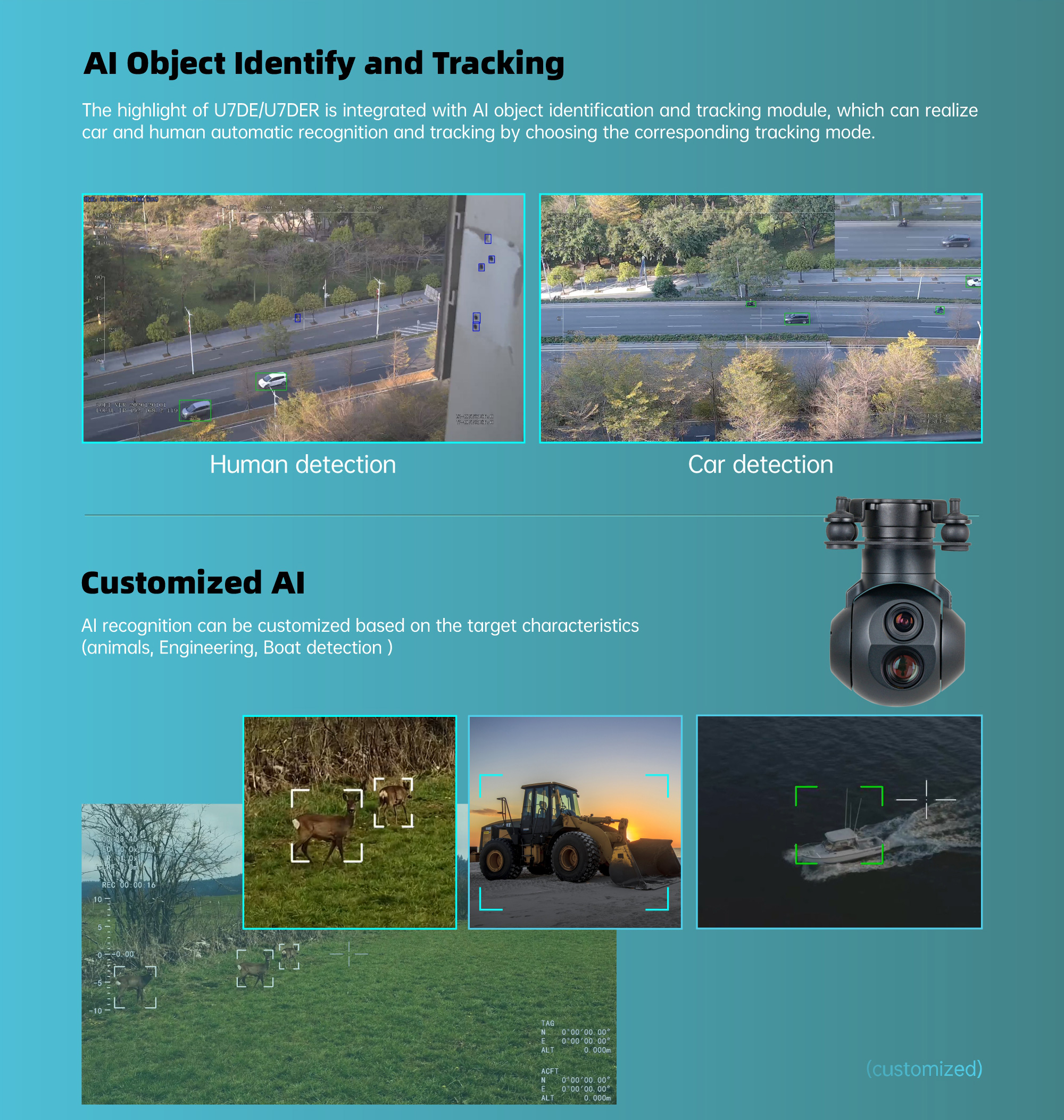 The highlight of MU7DE is integrated with AI object identification and tracking module, which can realize car and human automatic recognition and tracking by choosing the corresponding tracking mode.