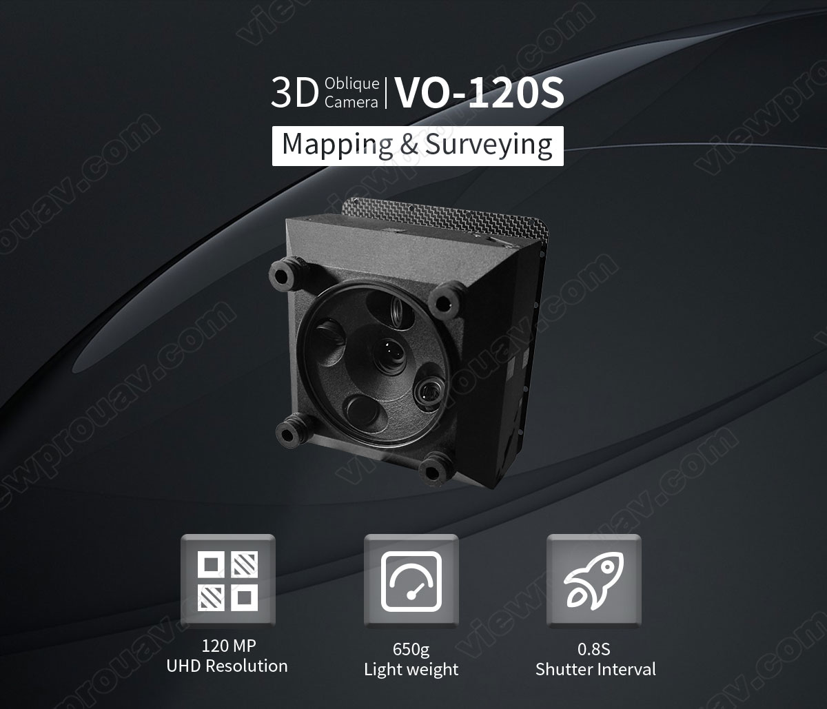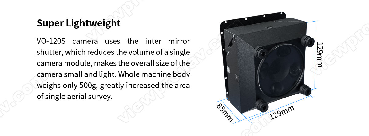 MVO-120S 3D Oblique Camera Mapping and Surveying with Geo Tagging Function China Moneypro Designed for profession mapping and survey missions. Support 3D modelling post processing. Get in Touch Product Detail Specification Model No. VO-120S Total Pixel 24MP*5 = 120MP Resolution 6000*4000 for single picture Sensor APS-C CMOS (23.5X15.6mm) Lens Size Orthographic 1*25.2mm + Oblique 4*35.7mm Oblique Lens Angle 45° Shutter Triggering High/low level signal (default) or PWM signal Shutter Speed 30-1/8000 Min Exposure Time 0.8s Data Read/Storage USB or SD card (max 128G*5=640G) Interfaces SD card slot, HDMI, USB, Hot shoe, aviation plug Parameter Setting Methods USB or button Power Supply 4S-7S (9-28V) Working Environment -20°C – 50°C Camera Dimension 129*129*85MM Net Weight 650g Package Dimension 30*25*20cm Related Products MQT032FA Portable Smart Sight MQT085F Optical Aiming Unit MQT160B Optical Aiming Unit MQT200T Portable Smart Sight